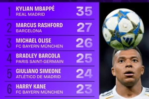 體育資訊10月23日訊 本賽季歐冠聯賽階段已戰(zhàn)罷3輪,Squawka統(tǒng)計了到目前為止對方禁區(qū)內觸球次數榜單,姆巴佩35次第一,拉什福德27次第二。