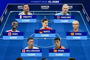 前鋒:亞馬爾(2億歐)、姆巴佩(1.8億歐)、哈蘭德(1.8億歐)、薩卡(1.5億歐)