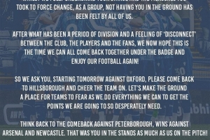 所以我們請(qǐng)求你們,從明天對(duì)陣牛津聯(lián)的比賽開(kāi)始,請(qǐng)回到希爾斯堡球場(chǎng)為球隊(duì)加油助威。讓我們把這座球場(chǎng)變成客隊(duì)恐懼的地方,因?yàn)槲覀儗⒔弑M所能去爭(zhēng)取我們?nèi)绱似惹行枰姆e分。