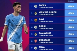 體育資訊10月25日訊 德轉(zhuǎn)盤(pán)點(diǎn)了在2025年足壇球員身價(jià)跌幅榜,其中福登下跌6000萬(wàn)歐最多,以下為具體榜單: