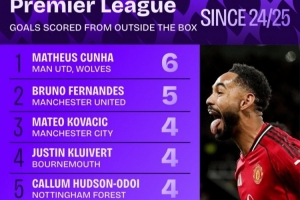 體育資訊10月26日訊 曼聯(lián)在本輪英超4-2力克布萊頓,庫(kù)尼亞遠(yuǎn)射建功。數(shù)據(jù)統(tǒng)計(jì)顯示他也是上賽季至今英超禁區(qū)外破門(mén)次數(shù)最多的球員。