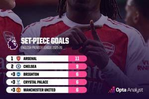 據(jù)opta數(shù)據(jù)統(tǒng)計(jì),本賽季阿森納已通過(guò)定位球打入11粒進(jìn)球,位列英超第1。