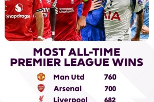 體育資訊10月27日訊 在本輪英超,阿森納1-0擊敗水晶宮,達(dá)成隊(duì)史第700場英超勝利。以下為英超歷史勝場數(shù)榜: