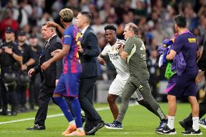 鏡頭切換到場邊,被替換下場的維尼修斯、替補(bǔ)門將盧寧與費(fèi)蘭、巴爾德等巴薩球員發(fā)生沖突。