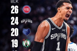 而截止目前,只有活塞、灰熊、凱爾特人、快船四支球隊的蓋帽總數(shù)比文班亞馬要多。