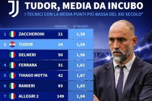 體育資訊10月28日訊 德轉(zhuǎn)統(tǒng)計(jì)表明,圖多爾執(zhí)教尤文場(chǎng)均1.58分,是21世紀(jì)場(chǎng)均積分并列第二少的尤文教練。