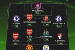 中場(chǎng):薩卡(阿森納)、賴斯(阿森納)、吉馬良斯(紐卡斯?fàn)枺?、塞梅尼奧(伯恩茅斯)