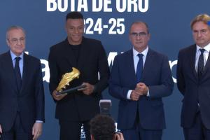 體育資訊10月31日訊 姆巴佩在伯納烏球場貴賓室領(lǐng)取上賽季的歐洲金靴獎杯。這是姆巴佩生涯首次斬獲歐洲金靴,也是烏戈-桑切斯和C羅之后的皇馬第三人。