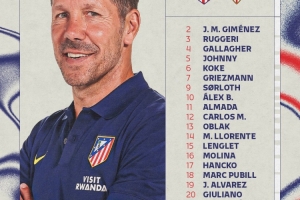 前鋒:7-格列茲曼、9-瑟爾洛特、11-阿爾馬達(dá)、19-阿爾瓦雷斯、20-朱利亞諾-西蒙尼、22-拉斯帕多里、23-尼古拉斯-岡薩雷斯