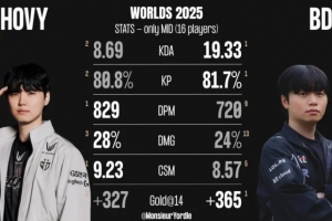 體育資訊11月1日訊 外媒統(tǒng)計(jì)Chovy與Bdd數(shù)據(jù)對比(S15全球總決賽),具體如下: