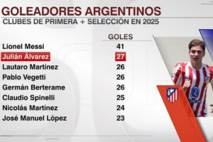進(jìn)入2025年,阿爾瓦雷斯在俱樂(lè)部和國(guó)家隊(duì)已打進(jìn)27球,阿根廷球員中僅次于梅西的41球。在阿爾瓦雷斯身后是勞塔羅(26球)、維格蒂(26球)、貝爾泰拉梅(26球)、斯皮內(nèi)利(25球)、尼古拉斯-馬丁內(nèi)斯(24球)以及何塞-洛佩斯(23球)。