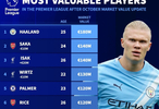 2025年10月17日德轉(zhuǎn)英超身價(jià)更新:哈蘭德仍居首,伊薩克漲幅顯著