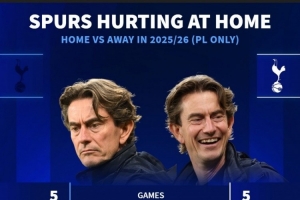 熱刺本賽季英超主場戰(zhàn)績1勝1平3負(fù),打進(jìn)5球丟掉5球,客場4勝1平保持不敗,打進(jìn)12球僅丟3球。