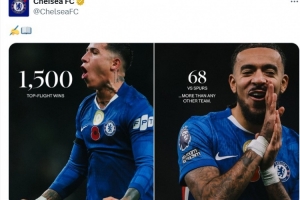 本場比賽也是切爾西隊史收獲的第1500場頂級聯(lián)賽勝利,其中對陣熱刺68場勝利是所有對手中最多的,藍(lán)軍官推也曬出海報紀(jì)念達(dá)成這一里程碑時刻。