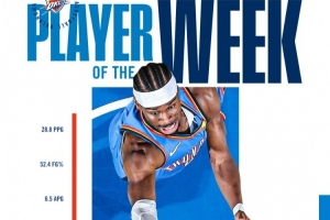 亞歷山大上周率領(lǐng)雷霆取得4勝0負(fù)的戰(zhàn)績,場均拿下28.8分4.5籃板6.5助攻。