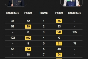 全場(chǎng)比賽,江俊打出一桿135分和兩桿50+(71、58),賀國(guó)強(qiáng)打出三桿破百(102、109、118)和三桿50+(61、58、56)