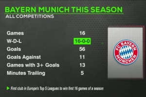數(shù)據(jù)統(tǒng)計顯示,拜仁在本賽季各項賽事16戰(zhàn)保持全勝,打進(jìn)56球、丟11球。有13場比賽能夠至少打進(jìn)3球,本賽季共計僅有5分鐘處于落后。