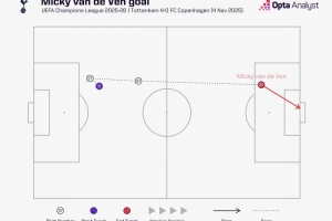 據(jù)Opta統(tǒng)計(jì),范德芬?guī)蚺軇?dòng)67.7米之后破門,這是2015年Opta統(tǒng)計(jì)相關(guān)數(shù)據(jù)以來,歐冠帶球距離最遠(yuǎn)的進(jìn)球。