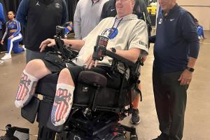 體育資訊11月06日訊 前NBA球員、53 歲的“大竹竿”肖恩·布拉德利今日坐輪椅觀戰(zhàn)獨行俠,并與他的獨行俠前隊友波派·瓊斯聊天。
