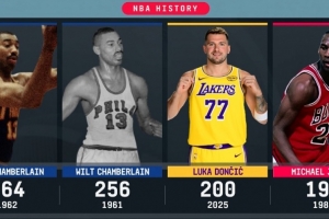 在賽季的前五場(chǎng)比賽中,東契奇合計(jì)得到200分,歷史第三高,僅次于張伯倫,詳情如下: