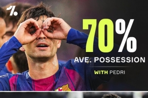 Onefootball統(tǒng)計(jì)了佩德里本賽季在場和缺陣時(shí)巴薩的控球率。佩德里本賽季出場時(shí)巴薩平均控球率70%,他缺席時(shí)巴薩平均控球率為50%,降低20%。