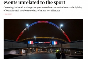 英足總、英超聯(lián)賽和英格蘭足球聯(lián)賽成立了“世界事件工作組”(WEWG),以指導(dǎo)英格蘭足球?qū)χ卮笫澜缡录姆磻?yīng)。除非事件與足球有直接關(guān)聯(lián),否則聯(lián)賽將不會舉行默哀儀式,也不會點(diǎn)亮溫布利球場的拱門。