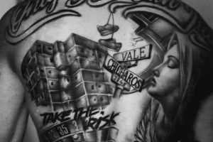 萊奧紋身的右側(cè)是圣母瑪利亞的頭像,左側(cè)是他從小生活的街區(qū)圖,中間還有兩塊路標(biāo),上面寫著萊奧家鄉(xiāng)塞圖巴爾區(qū)的郵編2845。紋身的左下方是一句口號“冒險”,旁邊是輪盤賭和四張A撲克牌。
