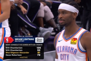 截至發(fā)稿,亞歷山大第三節(jié)4投4中拿到9分,三節(jié)18投10中貢獻(xiàn)24分,這也是亞歷山大連續(xù)第82場(chǎng)得分20+。