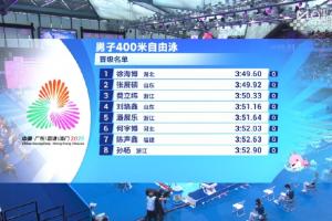 預賽總排名徐海博第一,潘展樂第5,孫楊排在第8驚險晉級決賽。決賽將于今日19:00進行