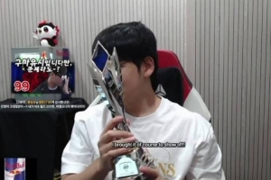 體育資訊11月10日訊 Gumayusi在直播間向粉絲們多角度展示FMVP獎杯;