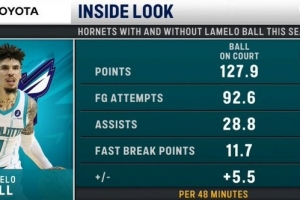 黃蜂自媒體曬出數(shù)據(jù),當拉梅洛出站時,黃蜂每48分鐘凈負8.5分,當他缺陣時,48分鐘凈勝5.5分。
