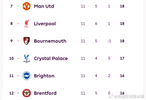 英超第3到12名之間只差4分,其中第5到第9名同積18分