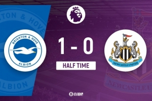 傷停補時5分鐘。上半場比賽結(jié)束,布萊頓1-0紐卡斯爾。