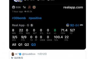本場(chǎng)比賽,庫里轟下46+5+5;在昨日被雷霆暴揍的比賽中,一位叫HoodiiBron的網(wǎng)友曬出庫里的數(shù)據(jù)截圖,并表示:“退役吧兄弟。”