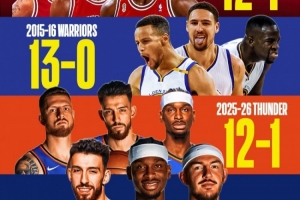 開賽13場后,雷霆以12勝1負(fù)的戰(zhàn)績追平了96公牛的同期紀(jì)錄,在杰倫·威廉姆斯因手腕傷勢持續(xù)缺陣的情況下,雷霆在13場比賽中凈勝對手202分,場均凈勝分高達(dá)驚人的15.5分。
