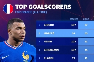 體育資訊11月14日訊 世預賽歐洲區(qū)比賽,姆巴佩梅開二度,法國主場4-0擊敗烏克蘭。姆巴佩為法國隊攻入55球,差2球追平隊史射手王吉魯。