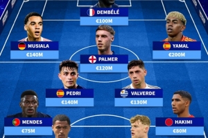 前鋒:穆西亞拉(拜仁,德國,1.4億歐)、登貝萊(巴黎圣日耳曼,法國,1億歐)、亞馬爾(巴薩,西班牙,2億歐)