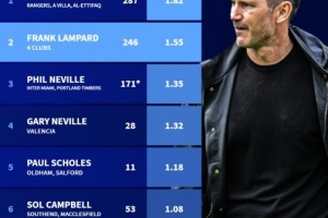 德國轉(zhuǎn)會市場盤點(diǎn)了英格蘭“黃金一代”球員在教練崗位上的執(zhí)教戰(zhàn)績,杰拉德以場均1.82分居首,蘭帕德以場均1.55分位居次席。