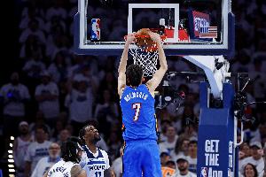 雷霆內線霍姆格倫上半場表現活躍,不僅有突破單手劈扣的精彩表現,籃板拼搶和防守上也充分發(fā)揮他的身高優(yōu)勢和靈活性。