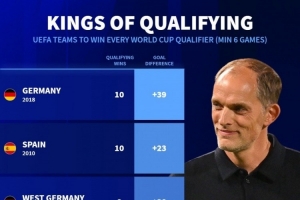 德國轉(zhuǎn)會市場盤點了單屆歐洲世預賽全勝球隊,德國、西班牙、英格蘭、荷蘭在列。