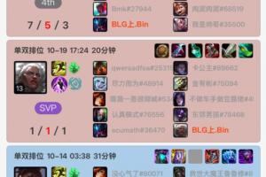 體育資訊10月19日訊 BLG上單Bin自14號凌晨后在今天再度開啟韓服Rank,使用一把挖掘機(jī)(7-5-3),一把狼母(1-1-1),兩把全負(fù)。