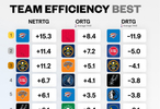 賽季至今各隊(duì)凈效率、進(jìn)攻效率以及防守效率前十