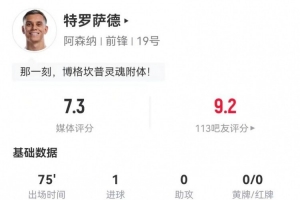 體育資訊11月24日訊 阿森納在本輪英超4-1領(lǐng)先熱刺,特羅薩德本場(chǎng)數(shù)據(jù)如下: