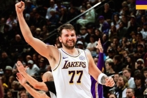 賽后湖人官方發(fā)布贏球海報(bào),封面為東契奇舉手慶祝瞬間。
