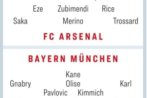 體育資訊11月24日訊 拜仁和阿森納在本輪聯(lián)賽各自取得大勝,兩隊(duì)也將在周中迎來(lái)歐冠榜首之爭(zhēng),拜仁作客挑戰(zhàn)阿森納?!短咔蛘摺芬差A(yù)測(cè)了雙方首發(fā):