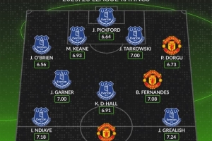 中場:詹姆斯·加納 (埃弗頓, 7.00分)、基爾南·迪尤斯伯里·霍爾 (埃弗頓, 6.91分)、布魯諾·費爾南德斯 (曼聯(lián), 7.08分)