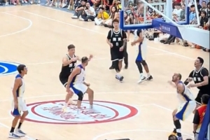 在本場比賽中,周鵬因?qū)κ址朗刳w睿動(dòng)作過大,揮拳直接把赫羅納男籃的14號干翻。