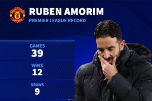 德國轉(zhuǎn)會市場統(tǒng)計了阿莫林執(zhí)教曼聯(lián)的英超數(shù)據(jù),他帶領(lǐng)曼聯(lián)參加39場英超比賽,戰(zhàn)績12勝9平18負(fù),凈勝球-10,場均拿到1.15分。