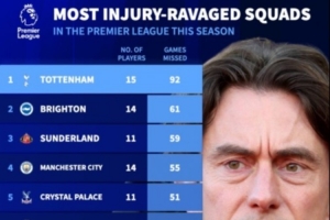 體育資訊11月25日訊 德轉(zhuǎn)列本賽季英超球隊傷病榜,熱刺15名球員受傷,共計缺席92場比賽排名第一,布萊頓、桑德蘭位列二三位。