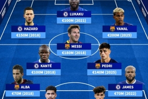 前鋒:埃登·阿扎爾(切爾西,1.5億,2018年)、羅梅盧·盧卡庫(kù)(切爾西,1億,2021年)、拉明·亞馬爾(巴塞羅那,2億,2025年)